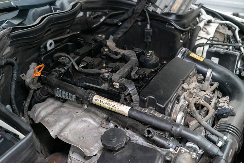 Представители Mercedes E-класса четвертого поколения пользовались немалой популярностью среди автовладельцев, в том числе автомобили в кузове купе. Именно такой автомобиль – Mercedes C207 E 250, приехал к нам на диагностику и выполнение ремонтных работ. В процессе диагностики Mercedes были выявлены следующие неисправности: износ верхней трубки охлаждения ДВС; износ прокладок клапанной крышки и масляного стакана; выработка опор ДВС и АКПП; выработка эластичной муфты и подвесного подшипника заднего кардана; выработка передних продольных сайлентблоков; износ передних тормозных дисков и колодок. Перечисленные неисправности являются типовыми для автомобиля с пробегом более 120 тыс. км и мотором M271. При своевременном устранении поломок автомобиль будет эксплуатироваться и дальше. Руководствуясь пожеланиями клиента, при выполнении ремонтных работы мы использовали оригинальные запчасти Мерседес и качественные аналоги. После ремонта подвески мы перешли к замене поврежденных прокладок и трубки