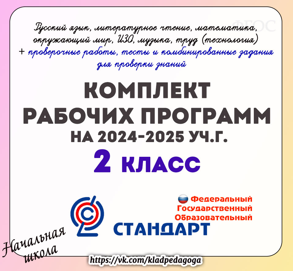 ● + Отличный Бонус! В комплект входят дополнительно: проверочные работы, тесты и комбинированные задания для проверки знаний для 2 класса. Приобрести рабочие программы и не только можно в магазине Wildberries "Кладовая педагога" по ссылке: https://digital.wildberries.ru/offer/251528 Также можно посмотреть у нас в сообществе VK Кладовая педагога У нас в сообществе вы найдёте много БЕСПЛАТНОГО материала к урокам и внеклассным мероприятиям. Присоединяйтесь к нашему сообществу VKонтакте Кладовая педагога, чтобы ничего не пропустить! Подписывайтесь на наш канал в Яндекс Дзен, чтобы быть первыми в курсе новинок. Подписывайтесь, мы Вас ждём)))