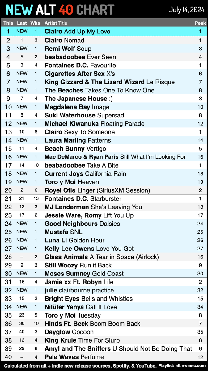 CLAIRO - лучший дебют недели, еще одна ее песня Add to my love поднимается на первое место, а Nomad - лидер прошлой недели теперь на втором.