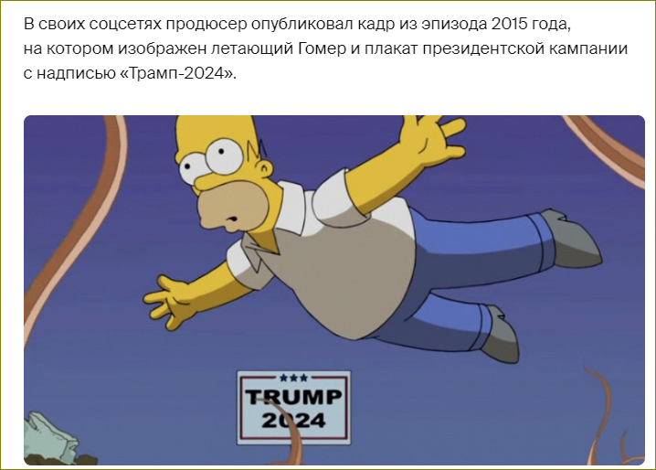 Так часто бывает, что задуманное в фильме накладывается на реальность и сбываются некоторые события. Феномен "Симпсонов" до сих пор удивляет по предсказаниям с четкими данными. Но особенно это касается почему-то Дональда Трампа, словно он путешествует во времени и вовремя подстилает соломку. Утром 14 июля 2024 года (по российскому времени), через 10 дней после празднования "Дня независимости", на кандидата в президенты Дональда Трампа совершено покушение. Во время выступления в предвыборной гонке Трамп получил оплеуху. На месте погиб один из зрителей, находившийся за своим любимым кандидатом. Раненый Трамп под прикрытием телохранителей, опираясь на твердое женское плечо охранницы двинулся с трибуны, поднимая руку сжатую в кулак с призывом "Прорвемся! Но пасаран!". В марте 2024 года выходит фантастический ужас-боевик с морем трупов под названием "Гражданская война". Российские киномаркетологи для подслащения и подлизывания власти обозвали фильм громким названием "Падение империи". Та во