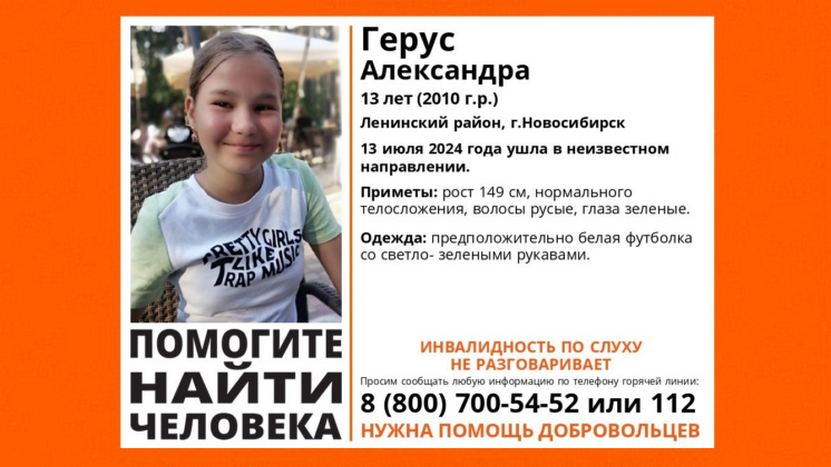 В Ленинском районе Новосибирска без вести пропала 13-летняя Александра Герус. Девочка 13 июля 2024 года ушла в неизвестном направлении. Теперь ее ищут волонтеры поисково-спасательного отряда (ПСО) «ЛизаАлерт».