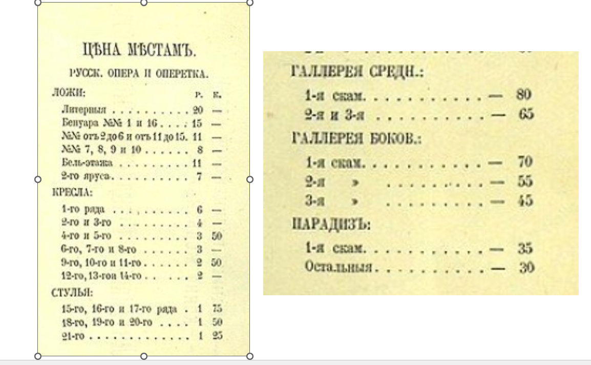 Второй раз ошибка выскочит при разделении на богатые и бедные сословия, при сепарации "чистеньких" и "чумазеньких", например, в театре. Одних зрителей от других отделяет цена. Литерная ложа - 90 рублей за место, галерка третий ряд - 45 копеек, самый дешевый парадиз - 30 копеек.
