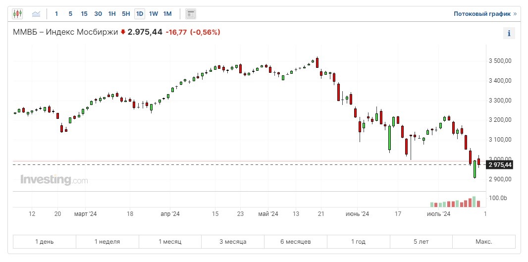 Индекс Мосбиржи уже находится ниже 3000 рублей. За эту отметку он зашел в среду 10 июля, затем в четверг 11 июля открылся уже в районе 2900 пунктов на дивидендной отсечке Сбера и Фосагро, после чего гэп был закрыт в течение дня, однако рынок не смог выйти обратно выше 3000 и в пятницу продолжил падение. Неделя закончилась на отметке ММВБ 2975 пунктов, и за нее индекс потерял 5,8%, что является максимальным недельным снижением с начала года, а падение 10 июля, включая вечернюю сесссию, стало самым сильным дневным снижением в текущем году. Если же посмотреть более длительный промежуток, то сейчас рынок находится на уровне годичной давности (июля 2023 года), фактически, растеряв все то, что сумел набрать за этот год. С пиковых значений мая рынок за 2 месяца упал более чем на 15%, это уже никак нельзя называть коррекцией - это, как минимум, нисходящий тренд, причем довольно сильный, ну а для очень многих эмитентов наблюдается настоящий обвал: они упали на 20-30-40-50%. Разницу между этими