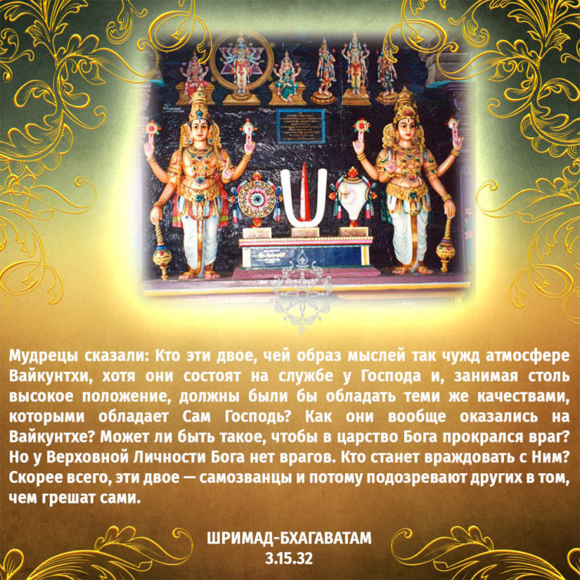 Услышав проклятие мудрецов, стражи сказали: Вы поступили совершенно правильно, наказав нас за непочтительное обхождение с такими мудрецами, как вы. Но мы молим вас о том, чтобы, видя наше раскаяние, вы сжалились над нами, и мы, упав в материальный мир, не оказались во власти иллюзии, которая заставляет живые существа забыть о Верховной Личности Бога. https://vedabase.io/ru/library/sb/3/15/36/