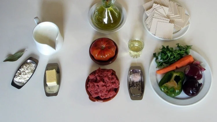 Ингредиенты: Фарш говяжий400г. Морковь 1 шт. Лук 2 шт. Перец красный 0,5 шт. Помидоры (крупный, спелый)1 шт. Лазанья (порционные пластинки)30 шт. Вино красное. 100 веточек. Чеснок 2 зубчика. Масло оливковое (для жарки)Соль перец черный. Молоко коровье750 мл .Масло сливочное 90г. Мука 90г. Сыр (тертый)50г Лавровый лист. Пармезан Лазанья — настоящая жемчужина итальянской кухни. Мы предлагаем классический вариант этого блюда — с мясным соусом и соусом бешамель. Подготовить ингредиенты. Подготовить пласты теста для лазаньи по инструкции на упаковке. Порционные листы для лазаньи брать из расчета 5 пластинок на человека. Классические пластинки нужно отваривать, но существуют и такие, которые можно просто замочить в горячей воде. Есть также полуфабрикаты, готовые к сборке без варки, и даже листы свежей пасты для лазаньи. Примечание: если выбранные вами пласты полагается отваривать или замачивать, возьмите их с запасом — на случай, если в процессе манипуляций какая-нибудь из них сломается. Лу