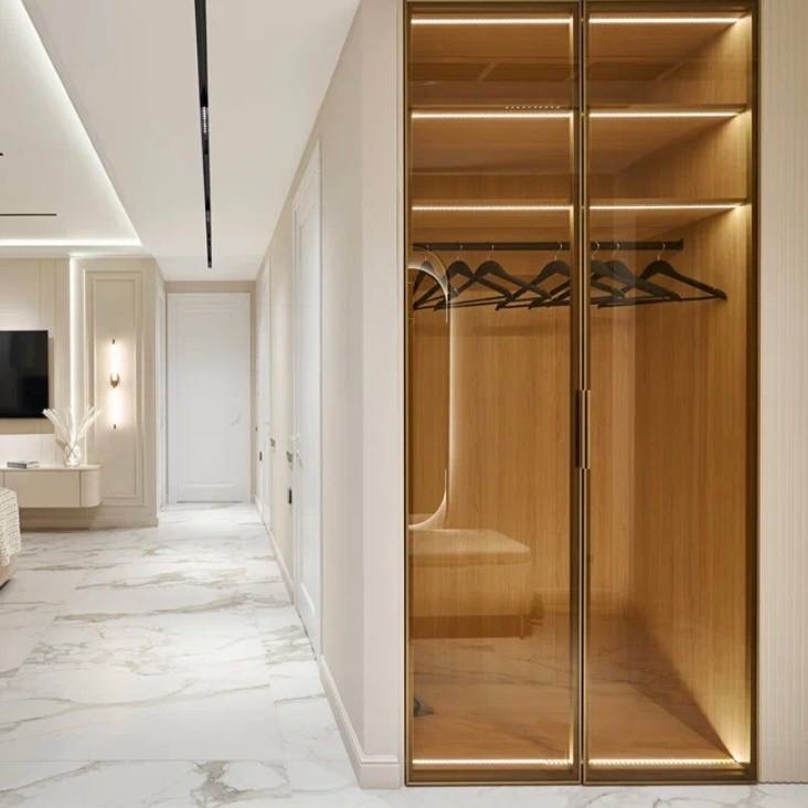 Реализованная прихожая с полутонированным шкафом. 🔥 Полутонированный шкаф, как же эффектно выглядит, еще и с подсветкой. 🛠️Материалы: ‘ Фасады МДФ эмаль ‘ Короба ЛДСП Egger ‘ Стекло тонированное полупрозрачное ‘ Стстема открывания распашная и от нажатия ‘ Подсветка внутри шкафа врезная по переду ‘ Фасады шкафа в золотой металлической раме с профильручкой. ‘ Банкетка по индивидуальным размерам 80х45см. ‘ Зеркало серебро осветленное ‘ Подсветка фоновая сзади ‘ Включение подсветки от выключателя. Я - ДИАНА МЕЧТЫ, переходи в мой профиль, в нём всё про ремонт мечты ✨