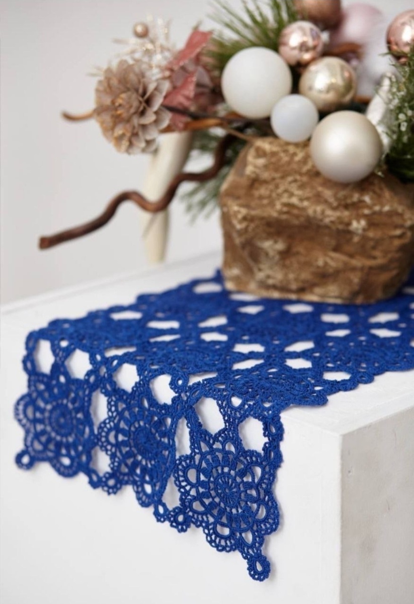 НОВИНКА Lace Like Love 💙 Ажурная скатерть в изысканном глубоком синем цвете 😍 влюбляет в себя с первого взгляда.⠀ Теперь она радует свою прекрасную хозяику в сердце столицы – Москве! 🏙️ 100% РУЧНАЯ РАБОТА⠀ ⠀Девушка прислала нам фото синеи дорожки с нашего сайта www.lacelikelove.ru сказала, что хочет такую скатерть, но нитками толще, для большого стола.⠀⠀ ⠀Вы знаете, что мы реализуем любую вашу идею ✨ Стали пробовать разную толщину нити, вязали образцы. Нитками среднеи толщины изделие получалось не мягкое, не струящееся, достаточно жесткое, из-за особенностеи узора, так как на нем много мелких, плотных элементов. Особенность этой скатерти, в том что мы переделали бабушкин квадрат в ажурные цветы со своими соединениями. В схеме много мелких плотных деталей, поэтому тонкими нитями кружево отлично держит форму и при этом очень красиво смотрится ⠀В результате связали скатерть тонкими нитями. И были абсолютно правы, получилась очень красивая скатерть, наша зака