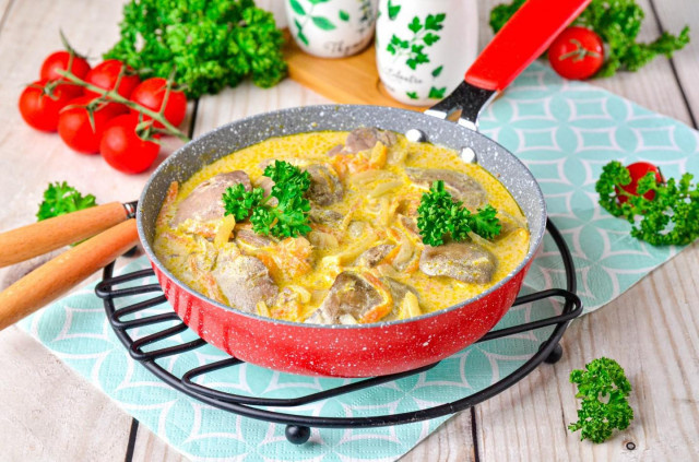 Куриная печень - 900гр Лук - 2шт Морковь -2шт Сметана - 300гр Вода - 1 стакан Растительное масло - 4 ст. ложки Соль - по вкусу Перец - по вкусу Как потушить куриную печень с луком и морковью в сметане на сковороде? Подготовьте продукты. Печень возьмите охлажденную — она получится сочнее. Если же печень замороженная, то разморозьте ее максимально деликатно, переложив из морозилки на нижнюю полку холодильника. Сметана подойдет любой жирности, желательно без растительных добавок. Лук очистите и нарежьте на четвертинки колец. Старайтесь нарезать максимально тонко, чтобы лук успел приготовиться. Чтобы при нарезке лука не раздражалась слизистая глаз, промойте луковицу и нож холодной водой. Морковь хорошо помойте и очистите. Натрите ее на крупной терке. Печень помойте и обсушите бумажными полотенцами. Нарежьте ее на кусочки, удалив при этом жилки и протоки, если они имеются. Разогрейте на среднем огне сковороду, влейте на нее растительное масло для жарки. Выложите нарезанные лук и морковь. О