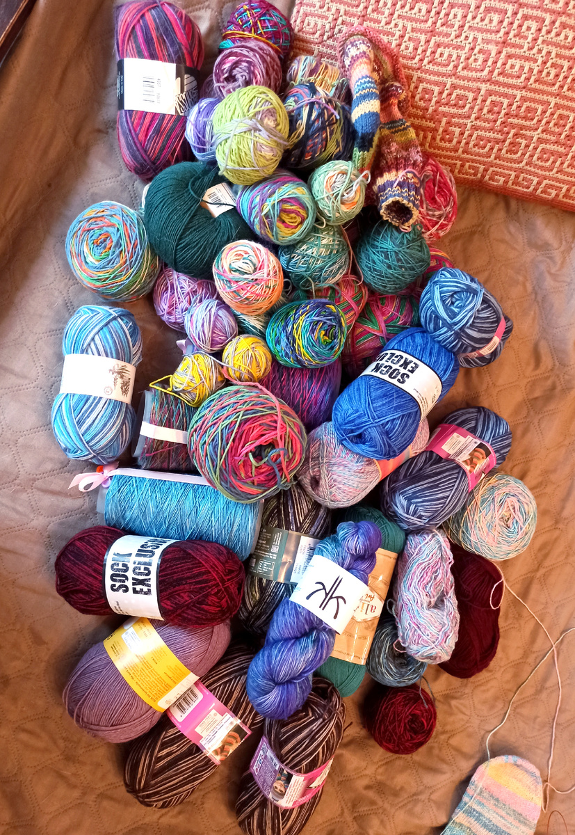 На несколько лет я забрасывала профиль на Ravelry, поэтому сколько всего у меня пряжи, представляю очень примерно. Давно собираюсь перебрать всю пряжу и внести в запасы. Решила начать перепись пряжного населения с носочной пряжи. Выгребла ее из контейнера и всех углов, по которым она была распихана. Не такая уж и огромная куча получилась, думала будет больше:)