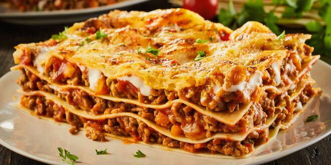 Ингредиенты: Для соуса Болоньезе: • 500 г говяжьего фарша • 1 большая луковица, мелко нарезанная • 2 зубчика чеснока, измельченных • 1 банка (400 г) измельченных помидоров • 1/2 стакана сухого красного вина (по желанию) • 1 чайная ложка орегано • 1/2 чайной ложки базилика • Соль и перец по вкусу Для соуса Бешамель: • 50 г сливочного масла • 50 г муки • 1 литр молока • Соль, мускатный орех по вкусу Для начинки: • 12 листов лазаньи • 250 г моцареллы, нарезанной ломтиками • 100 г пармезана, тертого Инструкции: 1. Приготовьте соус Болоньезе: В большой сковороде на среднем огне разогрейте 1 столовую ложку масла. Добавьте фарш и обжарьте до коричневого цвета, разминая его лопаткой. Добавьте лук и чеснок, жарьте до мягкости, около 5 минут. Добавьте помидоры, вино (если используете), орегано, базилик, соль и перец. Доведите до кипения, затем уменьшите огонь и тушите 30 минут, периодически помешивая. 2. Приготовьте соус Бешамель: В кастрюле на среднем огне растопите масло. Добавьте му