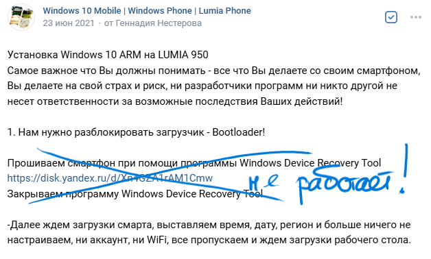 Здравствуйте, уважаемые читатели! Многим покажется заголовок достаточно скучным, потому что "ну сколько можно на эту тему, еще теперь и здесь". Однако, инструкции с профильных групп соцсетей и даже с 4pda на данный момент не до конца актуальны - на определенном этапе установка windows на смартфон застопорится без вариантов для ее решения. Собственно проблема затыка в установке windows на Люмию и решение этой проблемы и сподвигли меня написать данную статью. Итак, давайте начнем урок :) У нас на руках должен быть компьютер с OS Windows , смартфон Lumia 950/950 XL в работоспособном состоянии, кабель USB-Type C и несколько часов свободного времени. Ссылки на все программы и прошивки будут доступны в конце статьи Шить будем по инструкции из группы ВК "Windows 10 Mobile | Windows Phone | Lumia Phone". Пост от 23 июня 2021 года за авторством Геннадия Нестерова, но делать это будем с изменениями. Итак, пункт первый: Прошить через WDRT не выйдет. Не работает нынче программа. Поэтому сначала