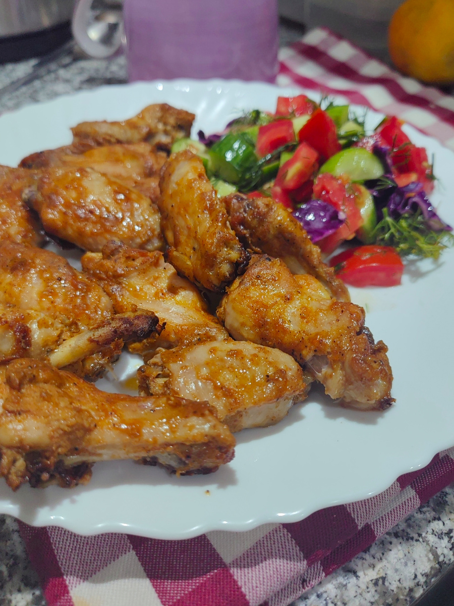 Уже писала, что муж уехал в командировку на три дня и можно почувствовать себя белым человеком. Знаю, что хейтеры будут кричать, мол , рабыня, фу, беги , старик .. и прочее. Но на самом деле люблю моменты и часы,когда никто не напрягает и можно полениться и не бегать с подносами из кухни в столовую или спальню. Потому готовила для себя. Уже писала, что купила крылышки маринованные в соусе "Тандури", их только оставалось приготовить в духовке. К ним сделала египетский салат из овощей- с лимонным соком и оливковым маслом. Всем огромное спасибо , я теперь поняла, что все маринады обычно идут с солью , иначе бы наверное подсолила и испортила бы еду. Поставила в духовку на минут 30. Хотела сделать порумянее, но верхняя газовая горелка отказалась вкючаться, не стала испытывать судьбу. Потому приготовила в режиме "низ" Вот что получилось, такая мелочёвка. Соли и специй очень умеренно, это прям порадовало очень. Остатки курицы отмыла от специй и у котиков и песиков будет вкусный ужин. Соус