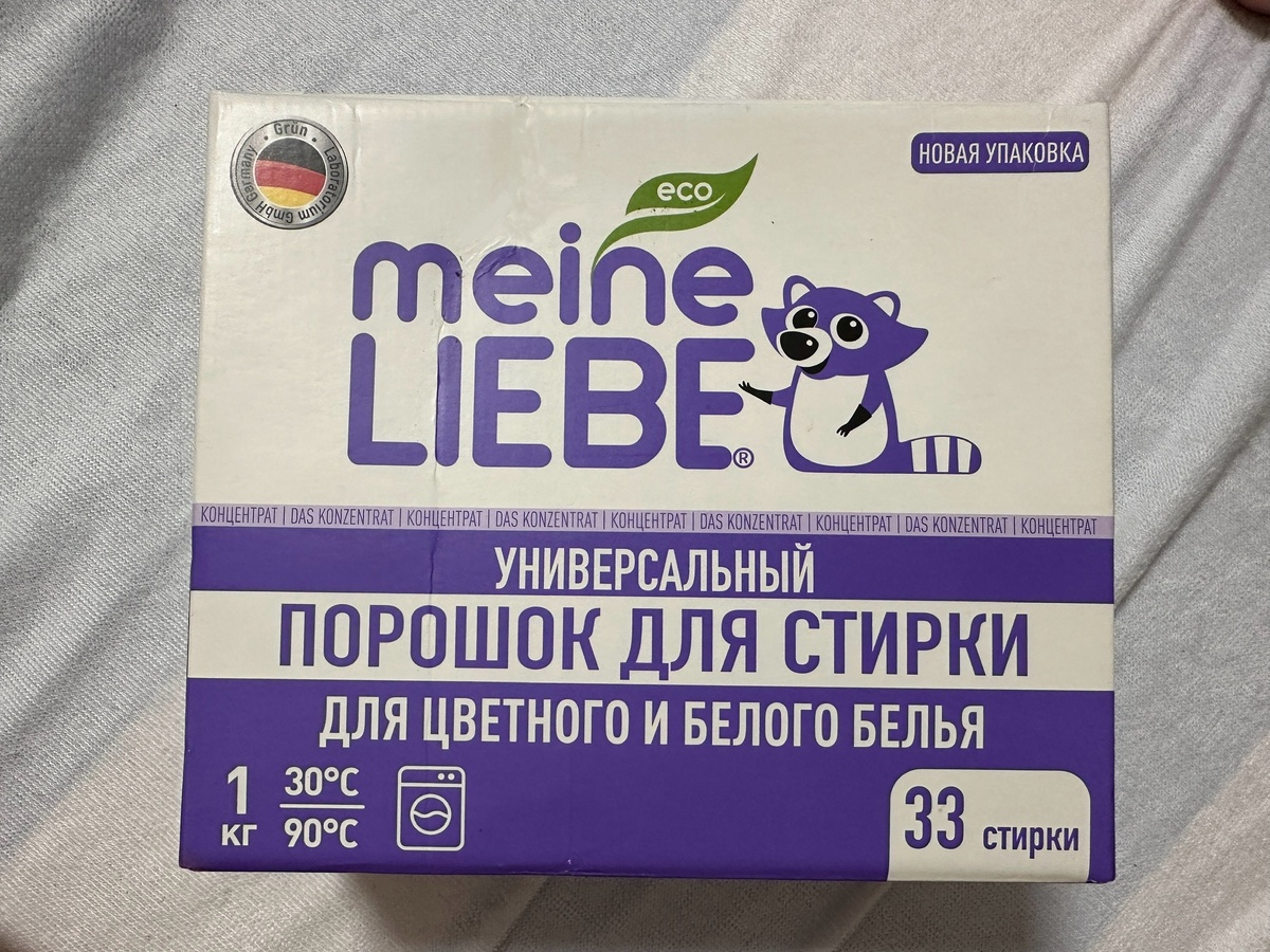 С появлением детей начинаешь задумываться о качестве продуктов, вещей, бытовой химии. И вот сегодня я расскажу о бытовой химии, а именно о порошке. Каким бы восхитительным не был аромат вашего порошка, он может вызвать аллергию! Поэтому именно аллергологи и дерматологи рекомендуют выбирать средства для стирки без запаха. Еще до рождения ребенка я читала эту информацию и остановилась при выборе на универсальном порошке Meine Liebe. У него отличный состав, который указан на упаковке крупным шрифтом, а еще с разъяснением каждого компонента. Он подходит для всех видов тканей, для белого и цветного белья. Концентрированные средства всегда покупать выгоднее, а еще они занимают меньше места. Здесь 1 кг, а постирать можно 33 раза. В каждой упаковке есть мерная ложечка, я их не выбрасываю, ребенок с ними потом играет в ванной. После стирки никакой отдушки нет. У ребенка аллергии тоже нет. Полностью выстирывается и не остается на вещах. Если надо освежить вещи, всегда достаточно одной ложки,