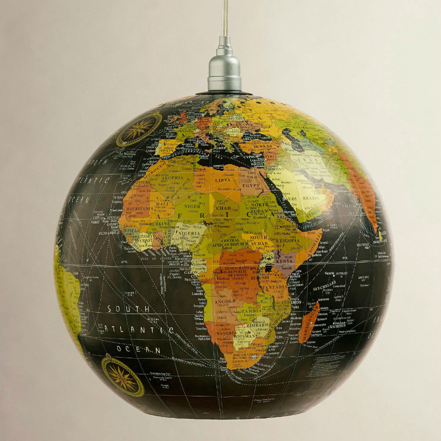 Если вам уже поднадоела ваша люстра или светильник, то его легко можно заменить на такой вот необычный винтажный абажур из глобуса. Нужен только старый глобус, наши советы и ваши руки. Снимите старый глобус с его базы и отрежьте с помощью ножовки нижнюю его часть (Южный полюс) по линии широты. В верхней части глобуса (там, где Северный полюс) карандашом обведите патрон вашей старой лампы или светильника и вырежьте там отверстие. Шилом проткните глобус по линиям контуров континентов. Вставьте в верхнее отверстие патрон и закрепите его согласно инструкции по сборке комплекта. Ввинтите в патрон лампочку на 60Вт — и все… Ваш винтаж-глобус готов к освещению вашего кабинета или спальни!