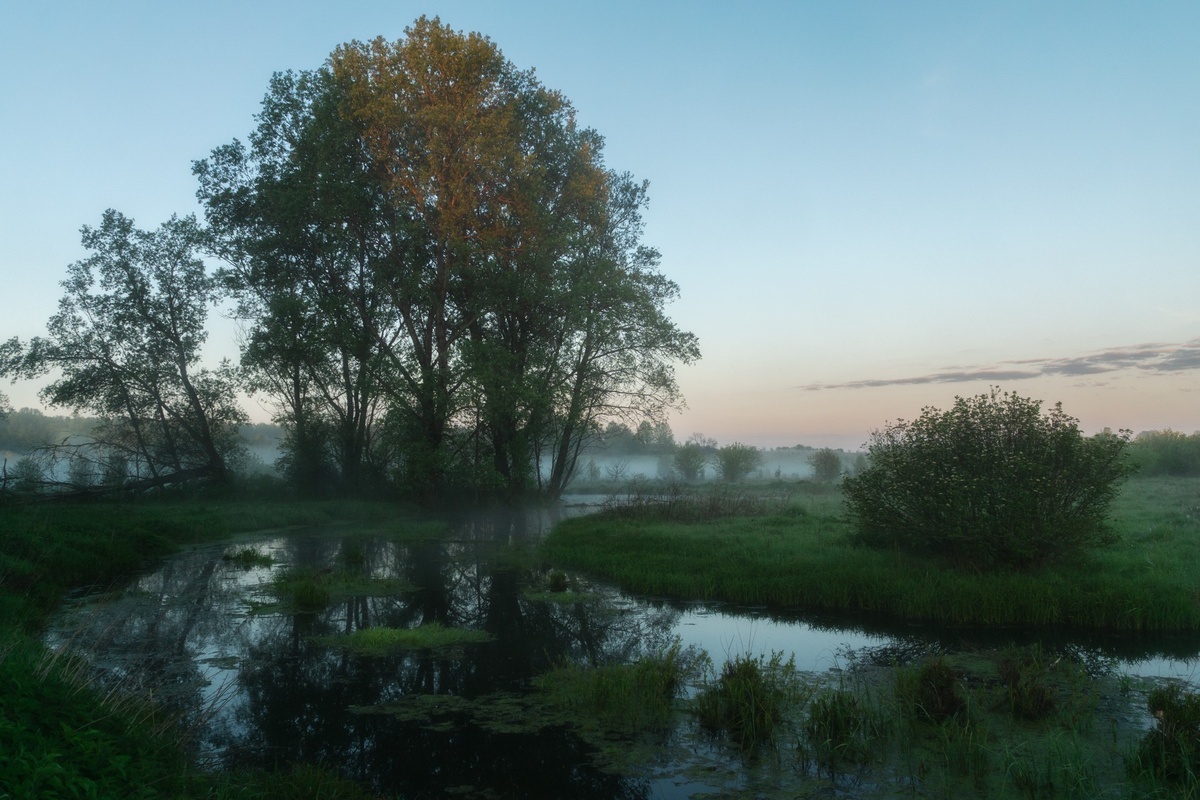 Когда солнце едва начало окрашивать небо в оттенки красного, в речной пойме сырой холод ещё бродит в кисельном тумане. Зябко, но пора выбраться из палатки, чтобы встретить новый день в его самом чудесном состоянии. Макушки столетних лип ещё не стряхнули сумерек и в своих могучих кронах скрывают распевающихся птиц. На перебой кричат кукушки, их сильнее — хор лягушек, который истово горланил всю ночь, и только теперь, на рассвете, квакают самые неугомонные. Никогда не замирает жизнь вдоль русла тихой реки. В зарослях цветущей акции звенит соловей, а чуть дальше у молодого осинника урчит странной песней козодой. В густой, изогнувшейся под весом обильной росы траве спрятался коростель, прозванный в народе дергачом за свою скрипучую однотонную песенку. А теперь притомился и притих. Время попить чаю. Первые лучи солнца пронзили ночную прохладу, которая лениво начала отступать всё ближе к реке, будто собираясь переждать жаркий день на её холодном, напитанном ледяными родниками дне. Вмиг эта в