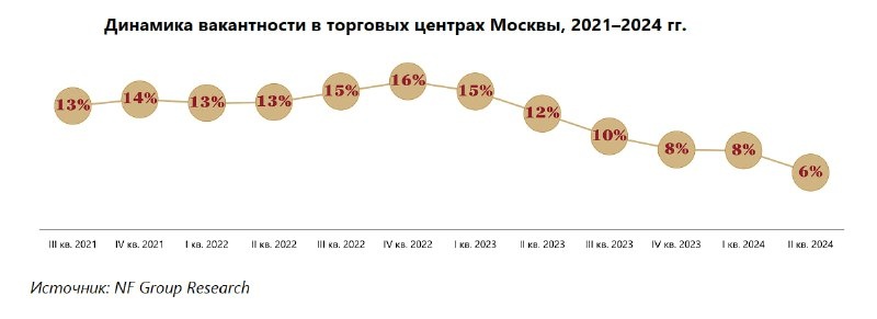 Объём вакантных площадей снизился до 6%, достигнув минимума с 2014 года. Российские ретейлеры воспользовались уходом западных брендов и расширили свое присутствие.