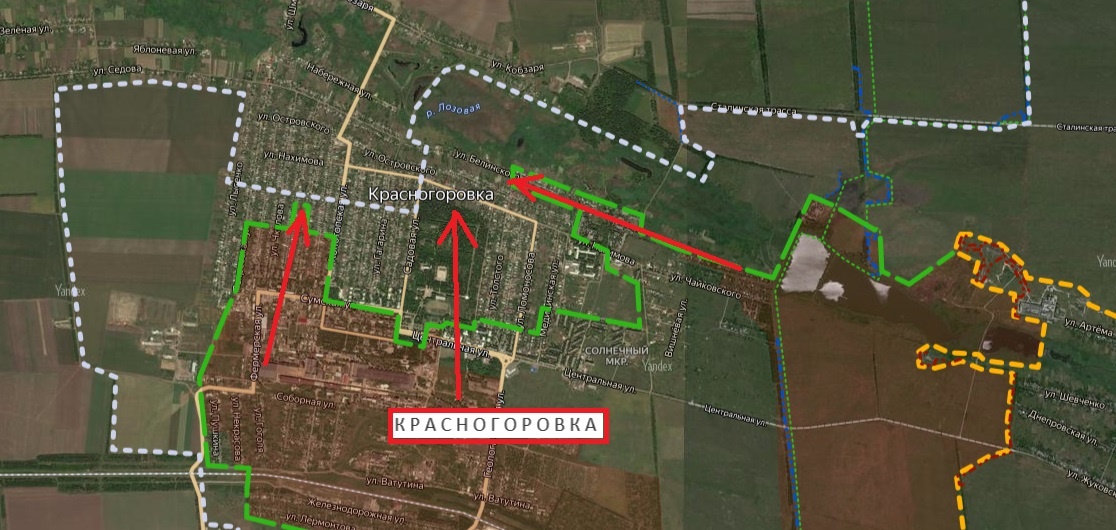 С момента нашего последнего включения из последнего оплота тут произошло много чего интересного, а самое главное, наши заняли ряд очень важных локаций, за которые небратья держались до последнего и с оставлением которых наши начали их плотно выдавливать всё дальше и дальше из города. В итоге сейчас тут уже показался финиш. Итак, сначала общая обстановка: Как видите наши тут очень неплохо продвинулись сразу по нескольким направлениям. Самое главное – мы полностью заняли район высотной застройки. На прошлой неделе мы туда зашли, заняли несколько крайних многоэтажек, а перед этим плотно взяли их в клещи. У небратьев осталось тут совсем немного вариантов, и они решили сваливать, удалось это далеко не всем. Не надо думать, что нам тут всё это далось легко и просто, после того как мы тут их взяли в полукотёл. Сами небратья отмечали, что наши работают с трёх сторон и держаться небратьям с каждым часом всё сложнее. В итоге наши в этом районе их дух выгнали. Но на этом останавливаться не стали