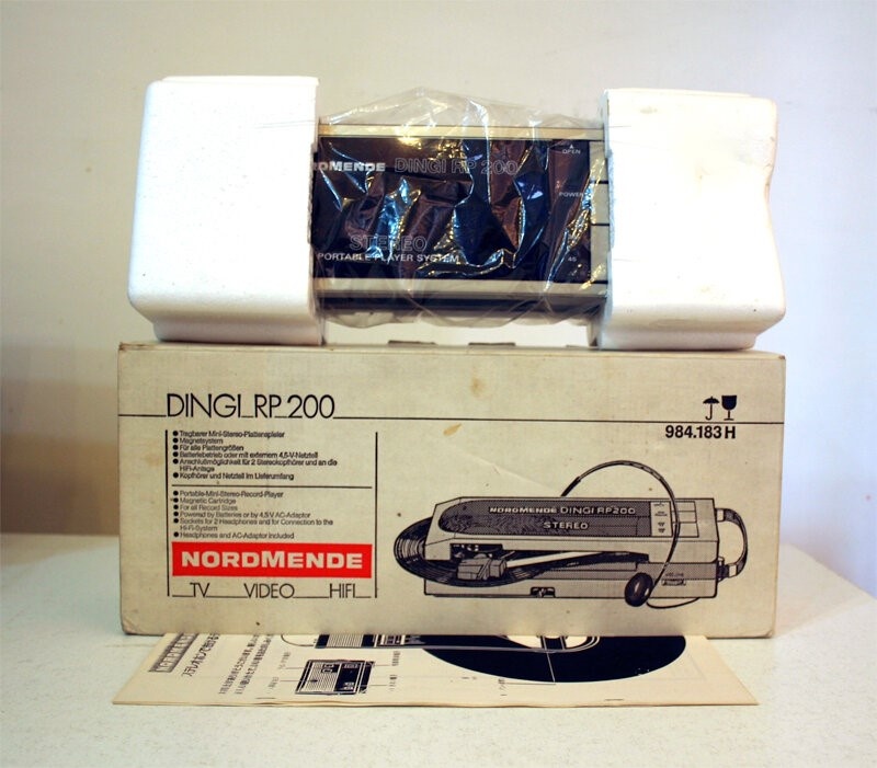 Сейчас, многие европейские или американские бренды имеют свои производства в Китае, а в 80-х практиковалось иметь представительства в Японии. Не исключением был концерн NORDMENDE, который часть своей продукции изготавливал на Японских заводах. Производственным партнером с Японской стороны выступала компания Audio Technica. Перед нами настольный проигрыватель виниловых пластинок NORDMENDE DINGI RP 200 Этот популярный малыш еще выпускался под маркой DUAL, а в версии Аудиотехники или Lo-D, с немного измененной крышкой, назывался SOUND BURGER. Производители выпускали их разных цветов и учитывая доступную цену, вертушки разлетались, как пирожки. Ценность этого экземпляра заключается в том, что он был куплен абсолютно новым, с индексом "не распроданный товар" со склада Японского ритейлера. Сравнивая с таким шедевром компактных виниловых вертушек как Sony PS-F9 , это конечно наивная погремушка, но тем не менее оказалась "капсулой времени" Ниже характеристики: Manufacturer: Nordmende / Audio