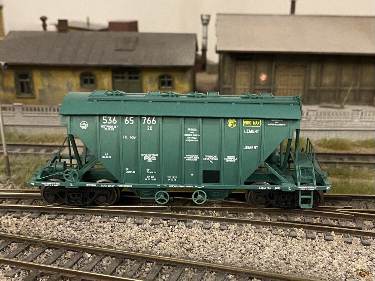 Модель хоппера для перевозки цемента серии 19-1217 в окраске транспортной компании Euro Max, изготовленная в масштабе 1:87 из набора для самостоятельной сборки производства Дмитрия Агапкина. Это четвертая модель в небольшой серии из шести моделей данного вагона, изготовленных в 2024 году. Ссылки на опубликованные ранее модели из этой серии добавлены в конце данной публикации. Как и предыдущие модели эта была собрана практически "из коробки". Добавлены лишь недостающие элементы тормозного оборудования, воздушные магистрали и оси разгрузочных люков, изготовленные из латунной проволоки; колесные пары и сцепки типа накидная петля от Evemodel. Набор декалей взят также из набора в базовом варианте, так как он уже максимально соответствует прототипу и не требует внесения каких-то изменений и дополнений. Вагон был завершен в состоянии "ка новый" без какого-либо намека на следы эксплуатации и в таком виде оперативно покинул производственную площадку, отправившись в другой город в частную колл