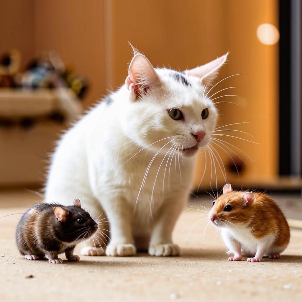 Крыса Соня и хомячок Жорик по началу были немного напуганы, когда увидели моих кис, но вскоре поняли, что коты совсем не такие страшные, как им казалось. Наоборот, они были игривыми и любопытными. Соня и Жора решили подружиться с ними. Обычно коты и грызуны (особенно крысы), не являются хорошими компаньонами для игр из за инстинктивного поведения котов, которые рассматривают крыс как добычу) Но не в моем случае… С тех пор, как мои коты полностью перешли на живое питание ( я писала о своих котах-сыроедах в этой статье), у них очень изменился характер. Они стали очень добрыми ( никакой агрессии) и дружелюбными. Когда они питались традиционно, ели всякую дичь, то и поведение у них было кардинально другим Конечно если коты находятся на традиционном питании, думаю лучше не оставлять их вместе без присмотра ибо это чревато…