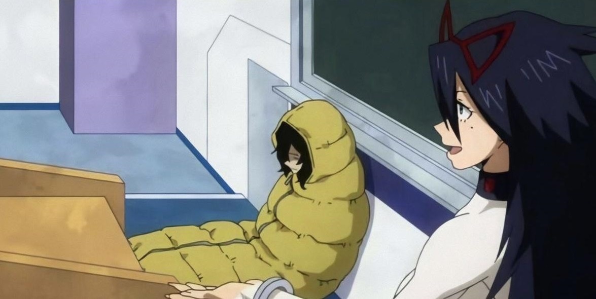 И сразу хочется сказать, что изначально Айдзава будет вызывать крайне смешанные чувства. Да это довольно серьёзный персонаж, но именно его сонливость станет сильно сбивать. Наш мрачный учитель будет использовать каждую секунду свободного времени, чтобы где-нибудь прилечь в спальном мешке и выкроить себе минутку на подремать, и при этом иметь он будет крайне недовольное лицо.