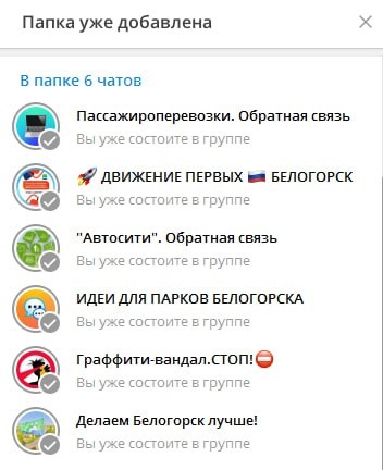 Единая подборка муниципальных Телеграм-каналов и ведомств Белогорска обновлена (https://t.me/belogorsk28ru/16286). Добавлена папка Агрегатор обратной связи (АОС). Она включает в себя официальные чаты разных сфер жизнеобеспечения города. Совокупное число участников групп составило почти 4 тысячи пользователей мессенджера. Самой многочисленной является группа "Делаем Белогорск лучше!". (https://t.me/makebelogorskbest) Создана она по решению главы города Станислава Мелюкова. (https://t.me/smeliukov/1048) Сейчас Единая подборка объединила более 70 Телеграм-сообществ по 9 направлениям. Суммарное число подписчиков Телеграм-сообществ города близится к 40 тысячам. Чтобы получить тематические папки, достаточно кликнуть по ссылке. Выбранное установится автоматически. Единая подборка Телеграм-каналов и групп на постоянной основе находится в закреплённых сообщениях Белогорск РФ (https://t.me/belogorsk28ru). Сервис доступен в последней обновленной версии Телеграм.