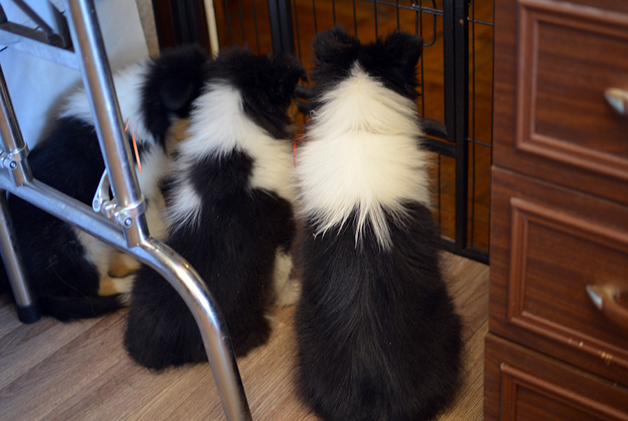 Единственное коллективное фото - слышат стук миски на кухне ))) Девочка Вера Девочка Варя - которая была маленькая, но почти догнала уже сестру Мальчик (зеленый) - Вине Мальчик (оранжевый) - Вальдо На момент съемки Вальдо был еще свободен. Собственно, это и было основной целью фотосета - отснять подросшего щенка для рекламы и объявлений.