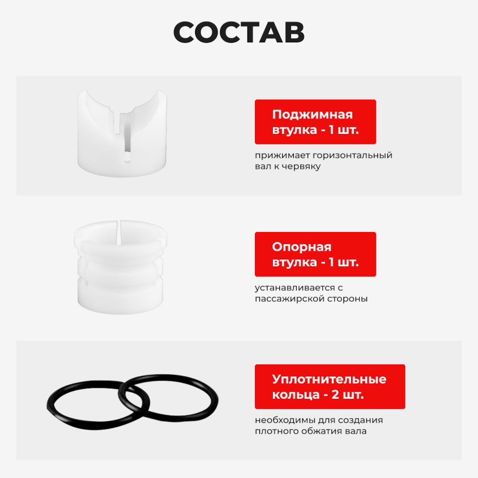 Бесит, когда руль вибрирует? Стук при поворотах начинает напрягать? Мы вас понимаем! Эти проблемы часто возникают из-за износа втулок рулевой рейки. Втулки выходят из строя из-за истирания и недостатка смазки. А когда туда попадает грязь и пыль, они действуют как абразив, ускоряя процесс износа. Теперь есть решение! Новый ремкомплект рулевой рейки поможет избавиться от этих проблем. Замена втулок вернет вашему рулю точность и четкость управления. В состав комплекта входит: поджимная втулка — 1 шт