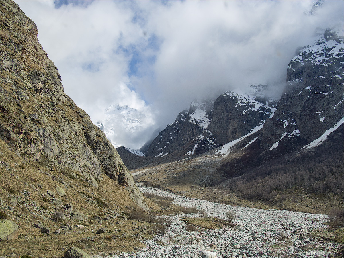 Потрясающе! Второе ущелье, перпендикулярно обрамляющие площадку альплагеря, тоже замыкается снежной стеной! Над бурлящей речкой, в раздёрнувшейся облачной завесе — ослепительно-белая стена! И суровые скалы, окаймляющие ущелье, укрытое ледником Мижирги…