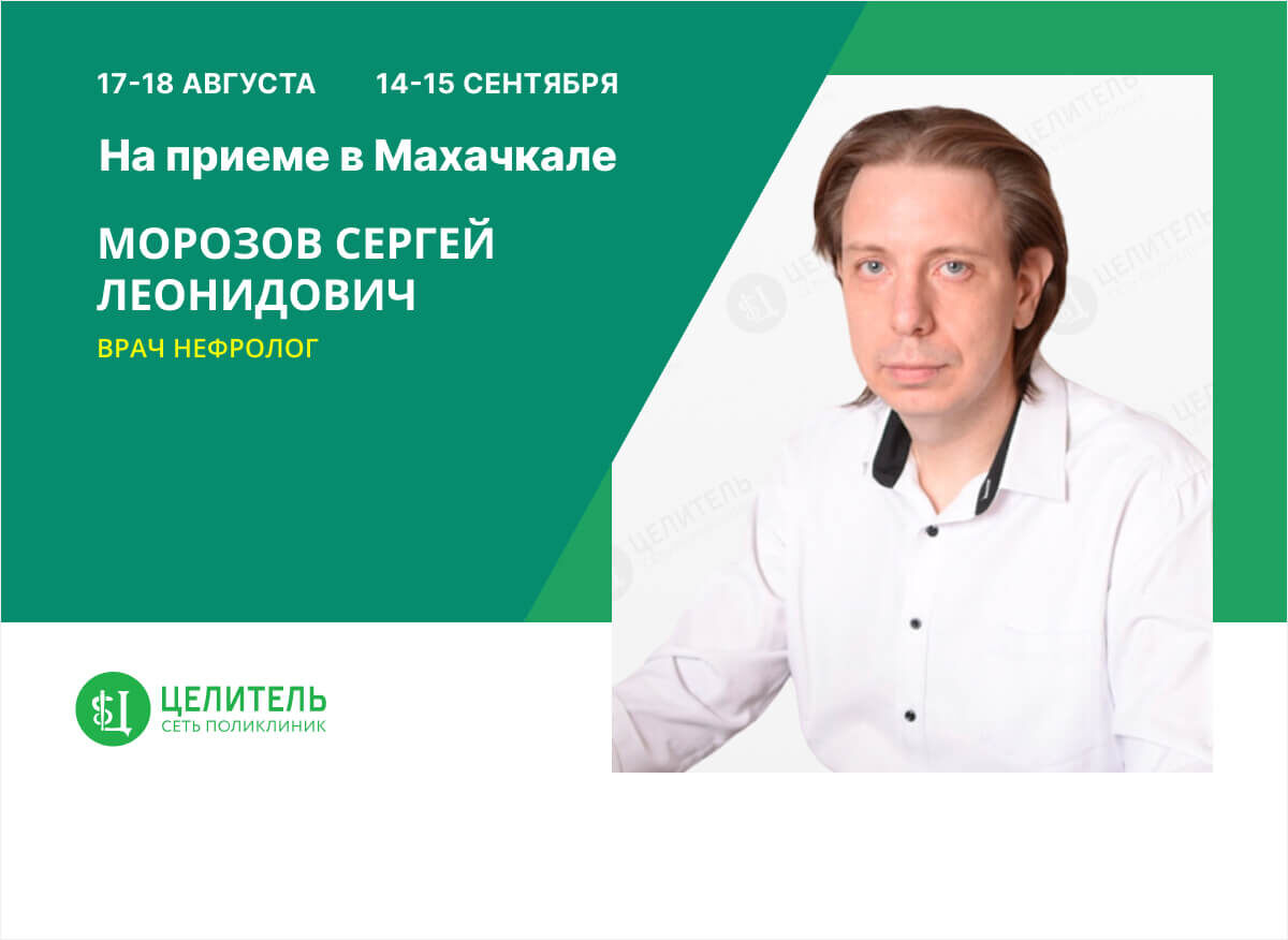17-18 августа, а также 14-15 сентября на приёме в медицинском центре "Целитель" в Махачкале приглашённый специалист, врач-нефролог, ведущий научный сотрудник отдела наследственных и приобретённых болезней почек им. профессора М. С. Игнатовой Научно-исследовательского клинического института педиатрии и детской хирургии им. академика Ю. Е. Вельтищева ФГАОУ ВО РНИМУ им. Н. И. Пирогова МЗ РФ, доцент кафедры госпитальной педиатрии №2 педиатрического факультета ФГАОУ ВО РНИМУ им. Пирогова Н. И. МЗ РФ, кандидат медицинских наук Морозов Сергей Леонидович. Высококвалифицированный доктор с богатым практическим опытом работы, учёный, имеющий более 100 научных работ по медицинской тематике, Морозов С. Л. проведет консультативный приём детей с такими болезнями мочевой системы, как: Морозов Сергей Леонидович также профессионально занимается функциональной диагностикой нарушений мочеиспускания в детском возрасте. Приём приглашённого детского врача-нефролога будет проходить в Махачкале в медицинской