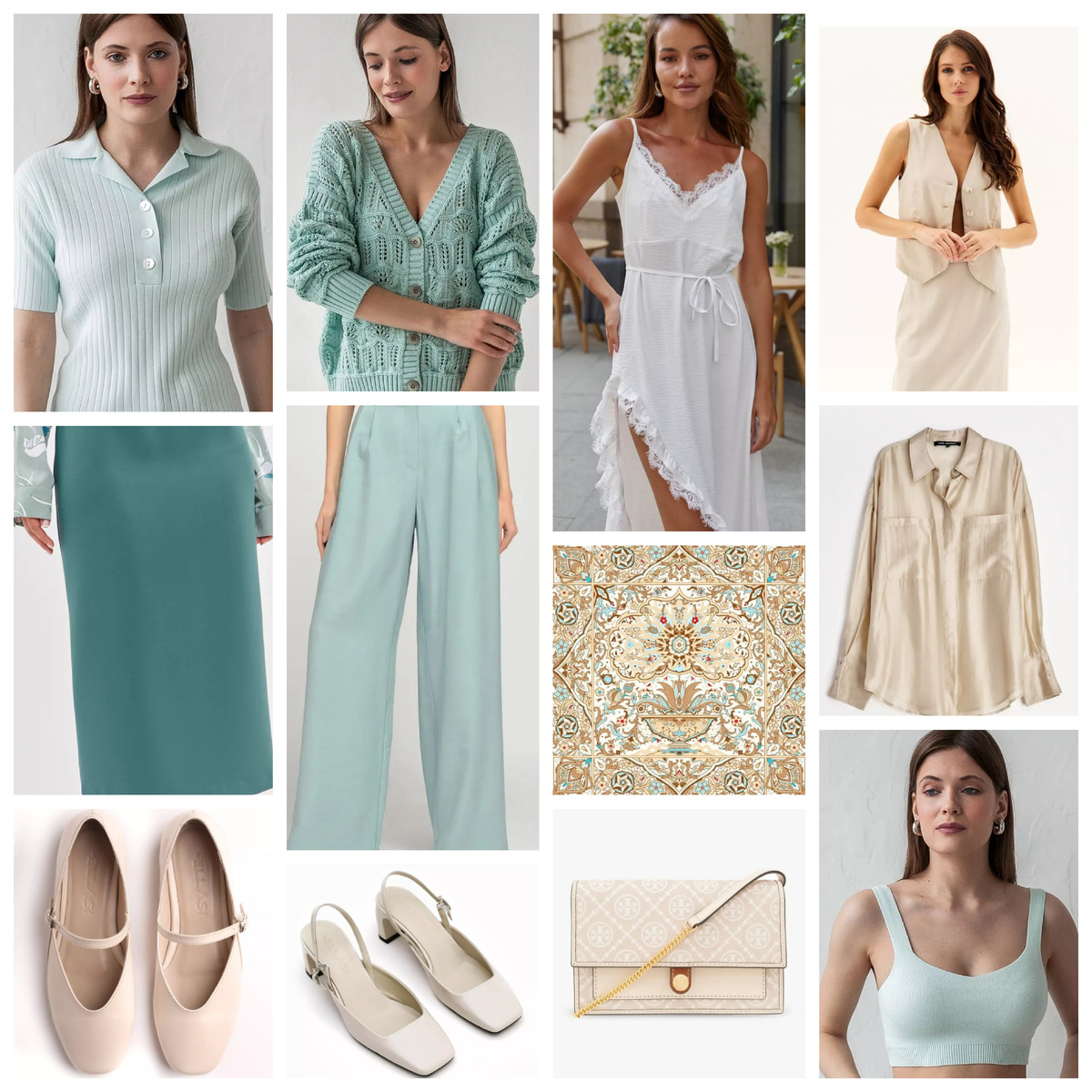 Из идей сочетаний: молочное, золотое, песочное, мятное и бирюзовое. Всё изложила на коллаже.