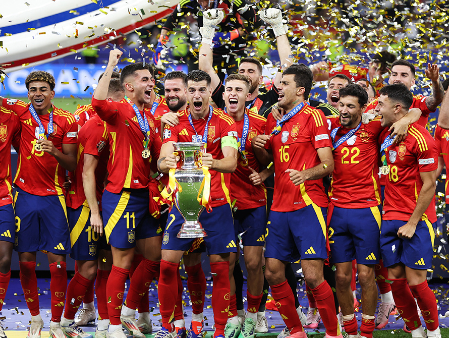 14 июля состоялся напряжённый финальный матч Евро-2024. За звание лучших боролись родоначальники футбола, сборная Англии, и команда Испании. Удача улыбнулась игрокам «Ла Фурия Роха» («Красной Фурии»), как называют испанцев болельщики — они в четвёртый раз выиграли чемпионский титул. Голевой пас, к слову, дал Ламин Ямаль — самый юный игрок в истории европейских чемпионатов. За день до финала, 13 июля, полузащитнику исполнилось 17 лет. Для болельщиков на арене «Олимпиаштадион» на фоне фаер-шоу выступили OneRepublic, DJ-группа Meduza и немецкая певица Leony (в 2024 году чемпионат принимала Германия). Они вживую исполнили гимн Евро-2024 — Fire, который наверняка станет хитом этого лета. Фото: Getty Images
