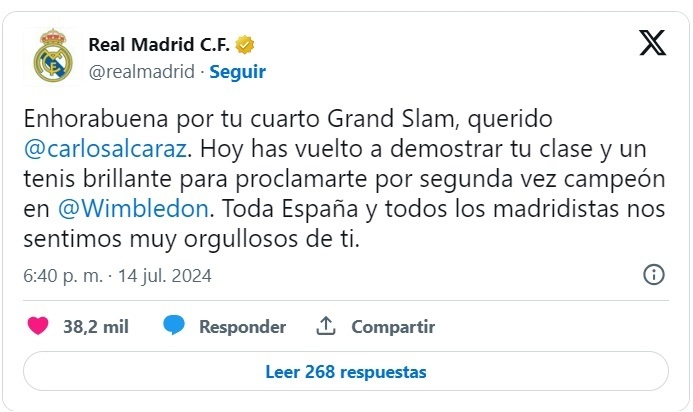 «Реал Мадрид» в социальных сетях поздравил Карлоса Алькараса с победой на «Уимблдоне» над Новаком Джоковичем (6-2,6-2,7-6). «Поздравляем с твоим четвертым Большим Шлемом, дорогой Карлос Алькарас. Сегодня ты снова показал свое мастерство и блестящий теннис, во второй раз подряд став чемпионом «Уимблдона». Вся Испания и все мадридисты гордятся тобой». Известно, что 21-летний Алькарас болельщик мадридского «Реала». Вчера ему удалось в четвертый раз в карьере выиграть турнир Большого Шлема: в активе третьей ракетки мира победы на «Уимблдоне» (2023 и 2024), «Ролан Гарросе» (2024) и Открытом чемпионате США (2022).