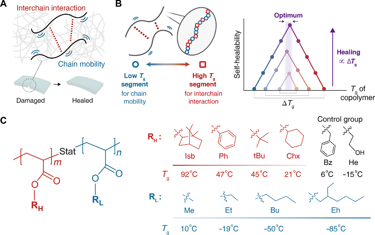 Способность материалов, особенно полимеров, к самовосстановлению повышает их функциональную стабильность и срок службы. На сегодняшний день конструкции самовосстанавливающихся полимеров основывались на специфических межмолекулярных взаимодействиях или химических свойствах. Мы сообщаем о методологии проектирования самовосстанавливающихся полимеров на основе стеклования. Была синтезирована статистическая серия сополимеров из двух мономеров с разными температурами стеклования (Tg), и их склонность к самовосстанавливанию зависит от Tg сополимеров и составляющих. Самовосстанавливание происходит более эффективно, когда разница в Tg между двумя мономерными звеньями больше в узком диапазоне Tg сополимеров, независимо от их функциональных групп. Самовосстанавливающиеся сополимеры бывают эластомерными и неполярными. Стратегия перехода от стеклования к самовосстанавливающемуся способу расширила бы область применения полимеров.