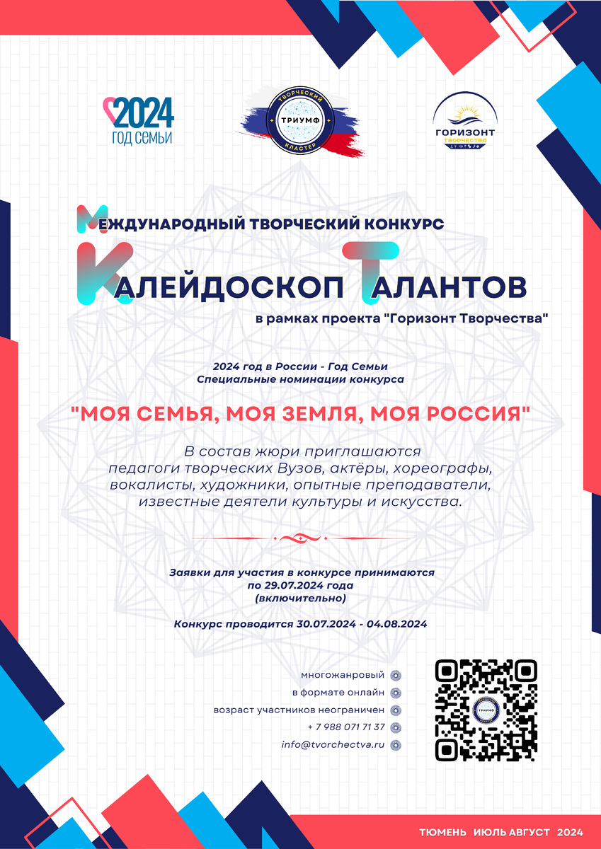 Основная цель конкурса - поддержка талантливых людей в реализации их творческого потенциала, укрепление роли и повышение статуса семьи в социально-культурном общественном пространстве. Конкурс многожанровый, проводится в формате онлайн. Для оценки конкурсных выступлений приглашается жюри, в состав которого входят педагоги творческих вузов, актёры, хореографы, вокалисты, художники, опытные преподаватели, деятели культуры и искусства. Специальная дополнительная номинация конкурса, приуроченная к Году семьи, - «Моя семья, моя земля, моя Россия» ; Льготная номинация "Яркий мир" для конкурсантов - детей инвалидов, детей сирот и детей, оставшихся без попечения родителей. Участие добровольное. Конкурсная программа свободная, не противоречащая морально – этическим нормам общества. Заявки принимаются по 29.07.2024г. Даты проведения: 30.07.2024 –04.08. 2024 г.