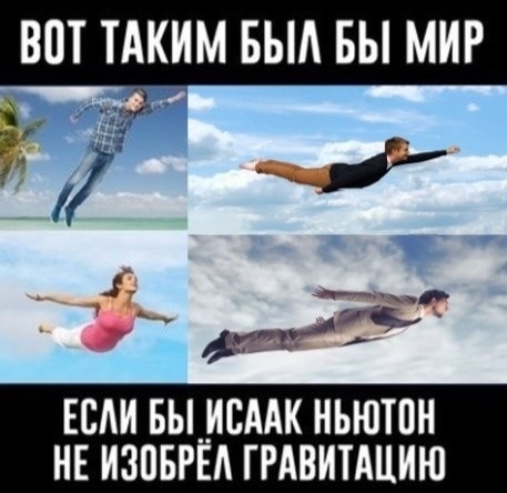 Если бы Ньютон не изобрёл гравитацию, мы все бы смогли летать. Вот вчера наткнулся на такой мемчик и задумался, а как вообще Ньютон до этого дошёл. Ведь все мы знаем, что историю о яблоке, упавшем на его голову. Но дело в том, что впервые ее рассказал Вольтер в своем эссе о Ньютоне. Сам же ученый никогда не рассказывал этой истории. Закон Всемирного тяготения формулировался Ньютоном на протяжении 20 лет и с помощью этого закона удалось объяснить траектории движения планет вокруг солнца. Пока все считали Землю центром вселенной, Ньютон уже понял, что планеты притягиваются к солнцу точно так же как и вы к холодильнику.
