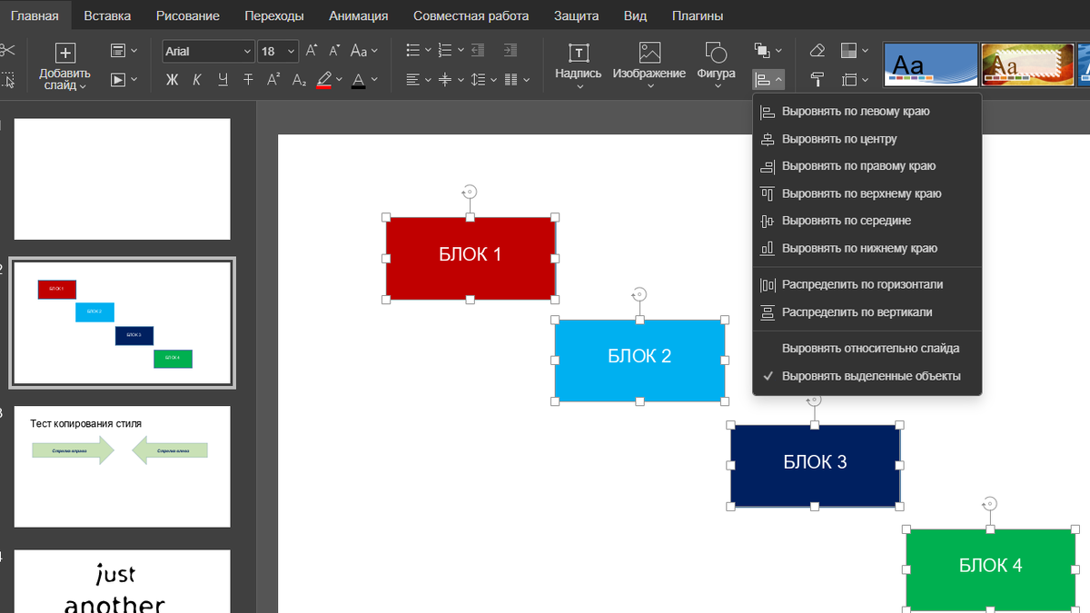 Функции редактора презентаций Сегодня у нас пост предельной простоты и полезности. Мы расскажем о стандартных функциях выравнивания и распределения объектов. Дело в том, что как правило на слайд помещаются несколько элементов: фото, текст, диаграммы, значки. Хорошо бы, чтобы всё это было расположено аккуратно. А главное, что это очень просто сделать: просто выделяете несколько объектов, а потом буквально пара кликов. Нужные нам команды, расположены в меню, которое открывается нажатием на кнопку, расположенную в центре вкладки главная: Что происходит при нажатии на разные команды, можно увидеть на гифке ниже: Если вы еще раз посмотрите на меню, то увидите, что внизу расположены две взаимоисключающие опции: «Выровнять относительно слайда» и «Выровнять выделенные объекты». По умолчанию выбрана вторая – объекты выравниваются относительно друг друга. Э тот режим на скринах выше. Если выбрать первую опцию, объекты будут выравниваться относительно границ слайда, как на иллюстрации ниже. Кстат