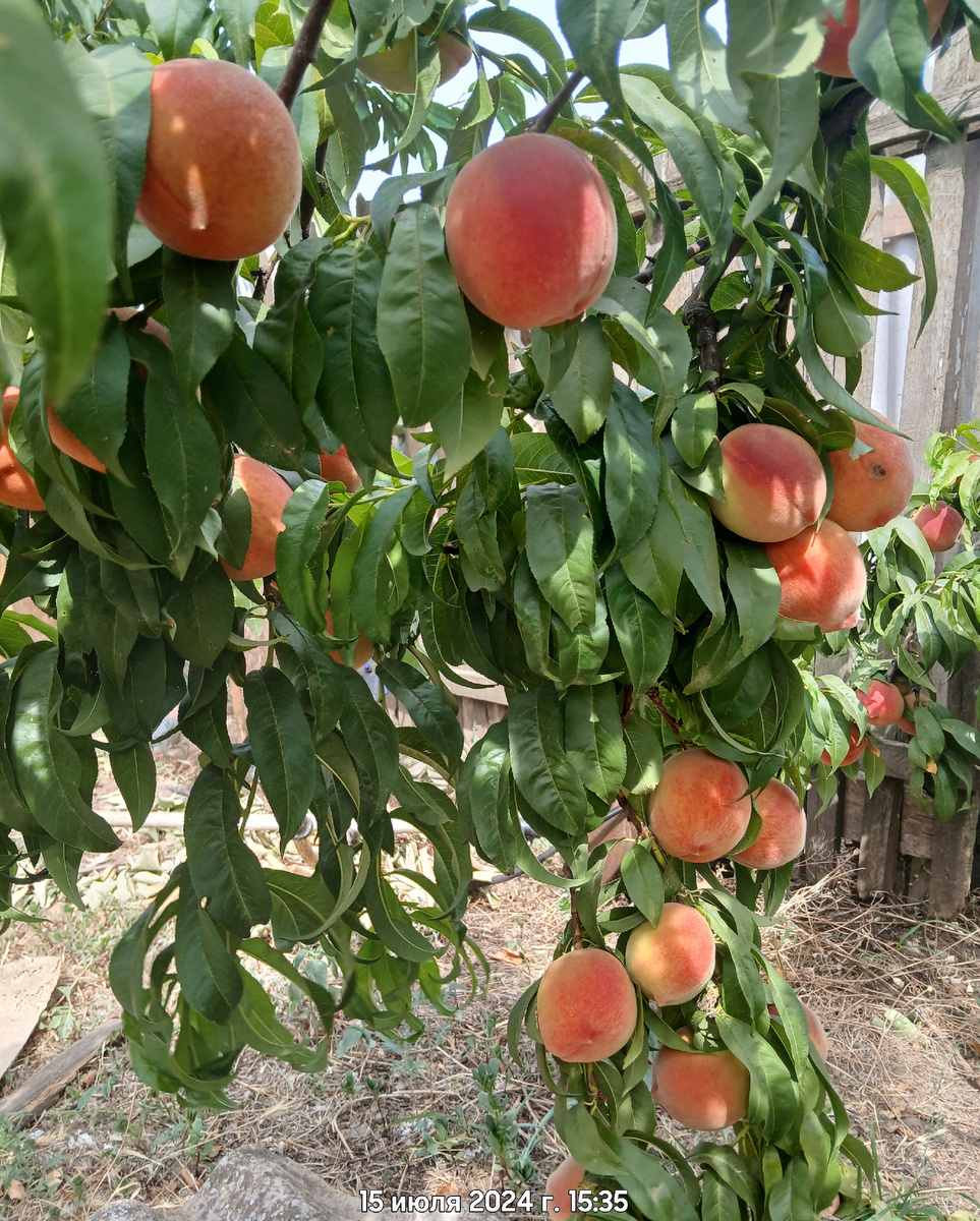 А можете посоветовать, какие сорта сливы, персика, нектарина Вам понравились. Хотим добавить плодовых деревьев) Вот давайте пару тройку сортов и обсудим. Персики в этом сезоне прут, хотя в общем то как и в прошлом году и в позапрошлом. Только всё больше и больше деревья выдают продукции. Персики - деревья добросовестные, излишки завязей не скидывают. Вовсю стараются. Вот сорт раннего персика Сочный. Купили мы его весной и посадили весной и зацвёл он тоже весной. Все завязи как это положено делать я обрывать не стала. Вообще это дело на совести каждого хозяина по отношению к своему дереву. А мне очень интересно и ждать недосуг. Ну вот очень мне интересно какой там плод на цвет и вкус. Саженец двухлетка и крепкий такой, вот и оставила. Завязалось несколько персиков и стала я с нетерпением ждать результат. Да, на нём почему то завязалось несколько вот таких сдвоенных. Почему не знаю - может так положено) Результат превзошел ожидания. Созрел одним из первых и оказался вкусным. И действител