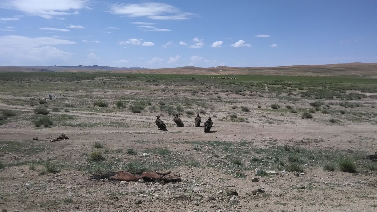 Дорога вновь проявляла свой переменчивый нрав: то радовала асфальтом, то погружала в клубы пыли и параллельность накатанных полос. До Улан-Батора осталось 630 километров, и шанс попасть туда сегодня виделся не таким уж призрачным. Стада коз сменялись овцами, коровами и лошадьми, и всё это на фоне бескрайней степи под таким же бесконечным небом. В гармонию чудесного утра неожиданно ворвалась сцена завтрака стервятников. Они вчетвером трапезничали лошадью на обочине и выглядели весьма довольными. Появление нашего автомобиля на дороге их слега спугнуло, но далеко они не улетели. Мы не стали им мешать, да и лошади уже не помочь. Следующей яркой картинкой в пути оказался кусочек пустыни в степи. Вдалеке виднелись приличные барханы, но и здесь, вдоль дороги песка было вдоволь. И в этом жарком царстве всё было по-настоящему. Даже верблюды имелись. Они отдыхали на привязи в воображаемой тени и ждали желающих прокатиться. Желающие тоже, кстати, были: радостно рассекали на кораблях пустыни чу