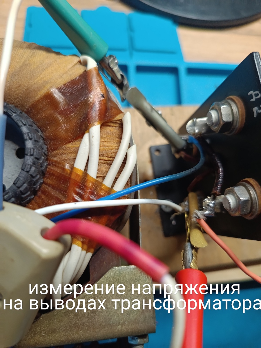 Принцип работы выпрямителя на основе диодного моста и стабилизатора напряжения" Вы наверняка уже знаете что я недавно собрал схему выпрямителя из старых советских радиодеталей. Для неё я взял трансформатор ТСТ-143, диодный мост из 242-д диодов, электролитические конденсаторы ELWA на 2200 mf (микрофарад), стабилизатор напряжения Tesla MA7805 и нагрузку (в данном случае — элемент, который работает только от постоянного тока), в качестве которой я взял резистор переменного сопротивления. Теоретически схема работает следующим образом: на трансформатор подаётся сетевое напряжение (220 вольт), с двух выводов этого же трансформатора напряжение выходит пониженным и приходит к выпрямителю, а с выпрямителя оно уже выходит на стабилизатор напряжения и под конец оно приходит к нагрузке. Ну конечно же хочется увидеть это всё на практике и самое главное — убедиться, что так оно и есть. Для того, чтобы показать принцип работы этой схемы я сначала буду измерять напряжение на выводах трансформ