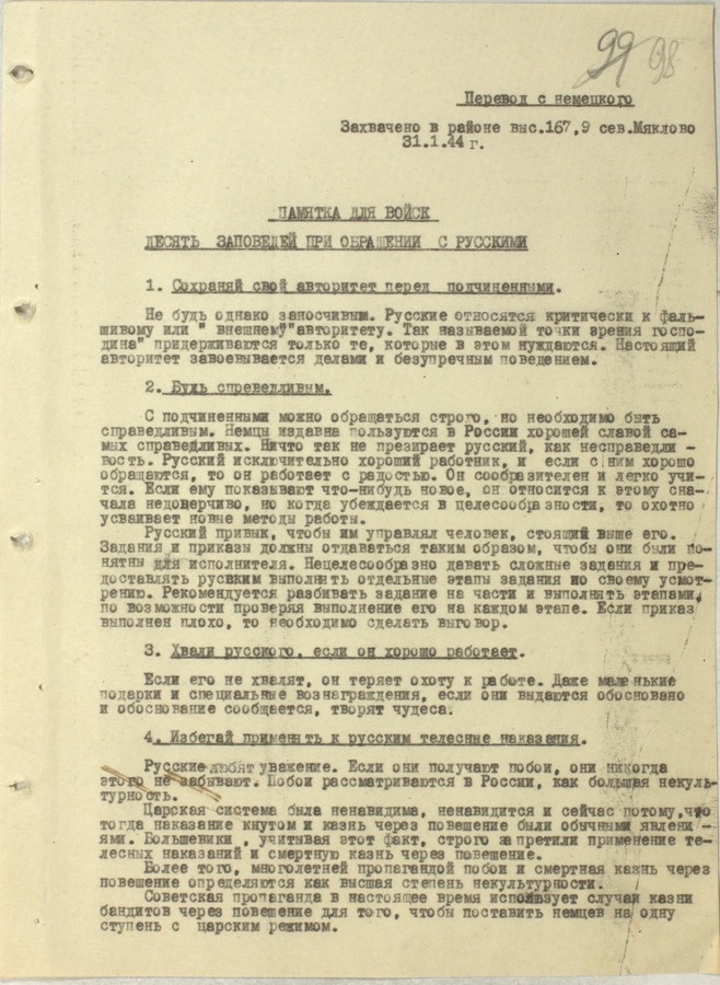 РАССЕКРЕЧЕННЫЙ НЕМЕЦКИЙ ДОКУМЕНТ поверг в шок! Германский исторический институт в Москве совместно с Центральным архивом Минобороны работу над раскрытием и оцифровкой документов времен Второй Мировой войны документы советской военной разведки — 341 папку с переведенными бумагами Третьего рейха, протоколами допросов военнопленных и личными письмами солдат. Маттиас Уль: Оценивая этот документ, важно понимать, в каком году он был выпущен. В начале Восточной кампании считалось, что русские вообще не нужны — и поэтому отношение было соответствующим. Но эта памятка не в 1941 году выпущена, а гораздо позже. К этому времени политика изменилась — уже стало ясно, что война не будет быстрой, что нужна рабочая сила из местного населения. Плюс уже появились планы создать воинские части, укомплектованные русскими, которые выполняли очень много работ в немецкой армии, поэтому планы на советских пленных действительно изменились. Но надо учитывать, что эта памятка содержит официальную позицию командов