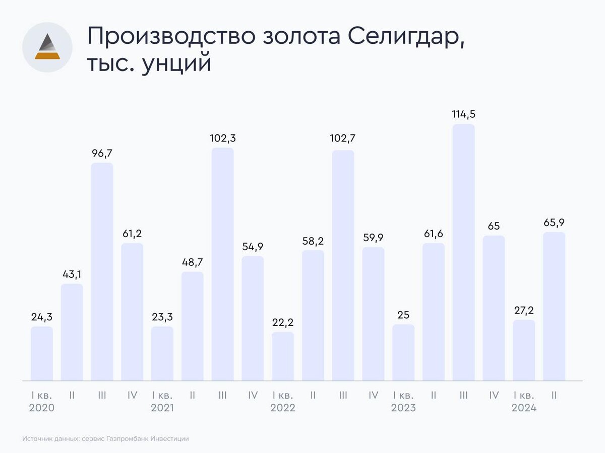☝️ Золотодобытчики в текущих условиях – одни из самых интересных объектов для инвестиций. Несмотря на длительный период рекордно высоких цен на золото, котировки акций в текущих условиях не демонстрируют позитивной динамики. 🌋Селигдар опубликовал производственные и финансовые результаты за первое полугодие текущего года. 🥇Производство золота увеличилось на 7% г/г., а объем его реализации на 18%. 🥈В производственной корзине компании также присутствуют другие металлы, такие как олово, медь, вольфрам, серебро. Производство олова сократилось на 14% г/г, а меди увеличилось на 67%. Производство вольфрама удвоилось, а серебра выросло на 46%. 📊 Совокупный рост производственных показателей и цен на металлы обеспечили рост выручки (без учета единоразовых операций по реализации золота и концентратов третьих лиц) на 47% г/г – до 20,6 млрд рублей. 👻 При этом за последние три месяца котировки снизились на 35%. 💪 Ожидаю дальнейший рост производственных и финансовых показателей