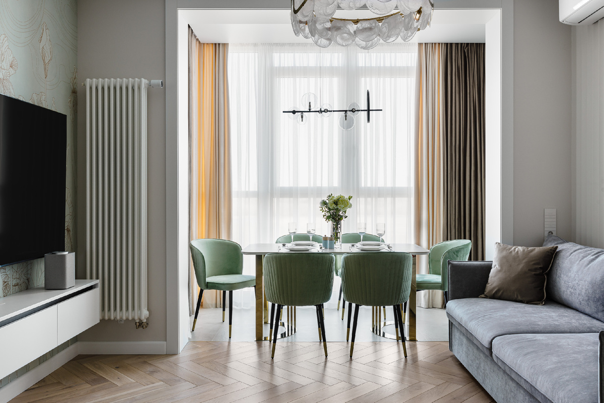 Проект «квартиры выходного дня» дизайнер Камилла Кадырова реализовала в чувственной и утонченной манере. Смесь тактильно приятных текстур и спокойных оттенков навевает расслабленную атмосферу отдыха, а внедрение актуальных решений в пространство облегчает семейный быт. Основной задачей стояло проектирование интерьера, напоминающего своим видом отель, так как заказчики не планировали постоянно жить в этой квартире. Поэтому основная концепция строилась на эстетике визуальной чистоты и практичности. Так, для сохранения ощущения легкого и свободного пространства была грамотно продумана система хранения — разработана большая функциональная гардеробная, через которую организован проход в «скрытую» мастер-спальню. С этой же целью был сделан выбор в пользу отказа от активной меблировки, чтобы не перегружать визуал изначально небольших помещений. Вместо этого комнаты наполняются простором и воздухом за счет современных интерьерных решений — стеклянная раздвижная перегородка в спальне имитирует