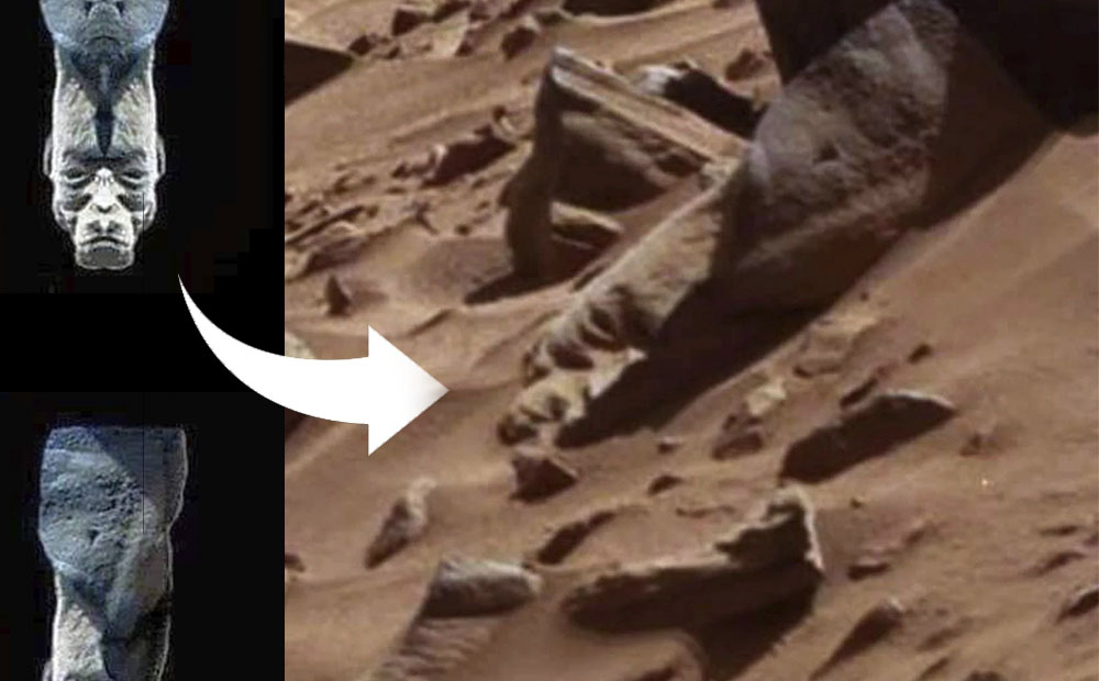 Теперь в соцсетях стало распространяться новое лицо, которое якобы является частью статуи. Ошибочно утверждается, что фото сделано в июне 2024 года, и, как и в случае с Марсианским сфинксом, видна только половина лица, хотя были приложены все усилия, чтобы искусственно создать фронтальный вид с помощью зеркального эффекта. Результат ошеломляет, потому что, по сути, это похоже на человеческое лицо, которое некоторые, не колеблясь, связывают с египетской цивилизацией.