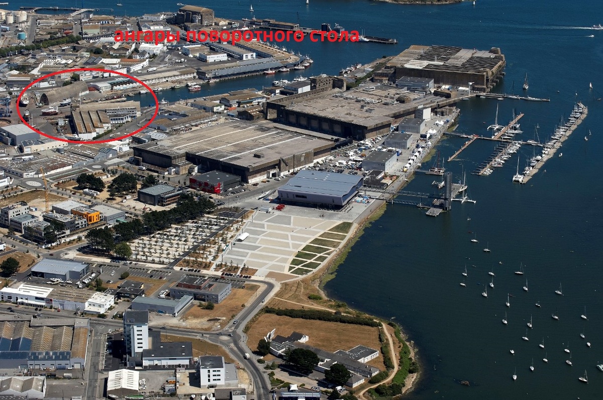 В нашем рассказе о подводных лодках "замаячила" база подводных лодок в Лорьяне. Весьма любопытный объект, ныне имеющий статус музея, но... Это не один объект. Начнем с того, что в Лрьяне был штаб подводных сил Кригсмарине, но располагался он в замке (а, ныне это частная собственность, и попасть туда... не вышло). Портовый Лорьян сдался Вермахту 21 июня 1940 года и вскоре превратился в важнейшую базу подводных лодок Кригсмарине. Первым районом, введенным в эксплуатацию в качестве причала для подводных лодок, была рыбацкая пристань Керомана на реке Ле Блаве, между районами Кероман и Ла Перьер. Немцы использовали французскую "наработку" для траулеров пелагического лова (длиной до 65 метров), которая представляла собой подъемник, поворотный стол и 12 сухих "боксов", расположенных по кругу, которые немцы приспособили для подводных лодок серии VII (боксы удлинили на 2 метра и усилили подъемник до 700 тонн). (Планировка четко читается, но поворотный стол не сохранился ). Первая ло