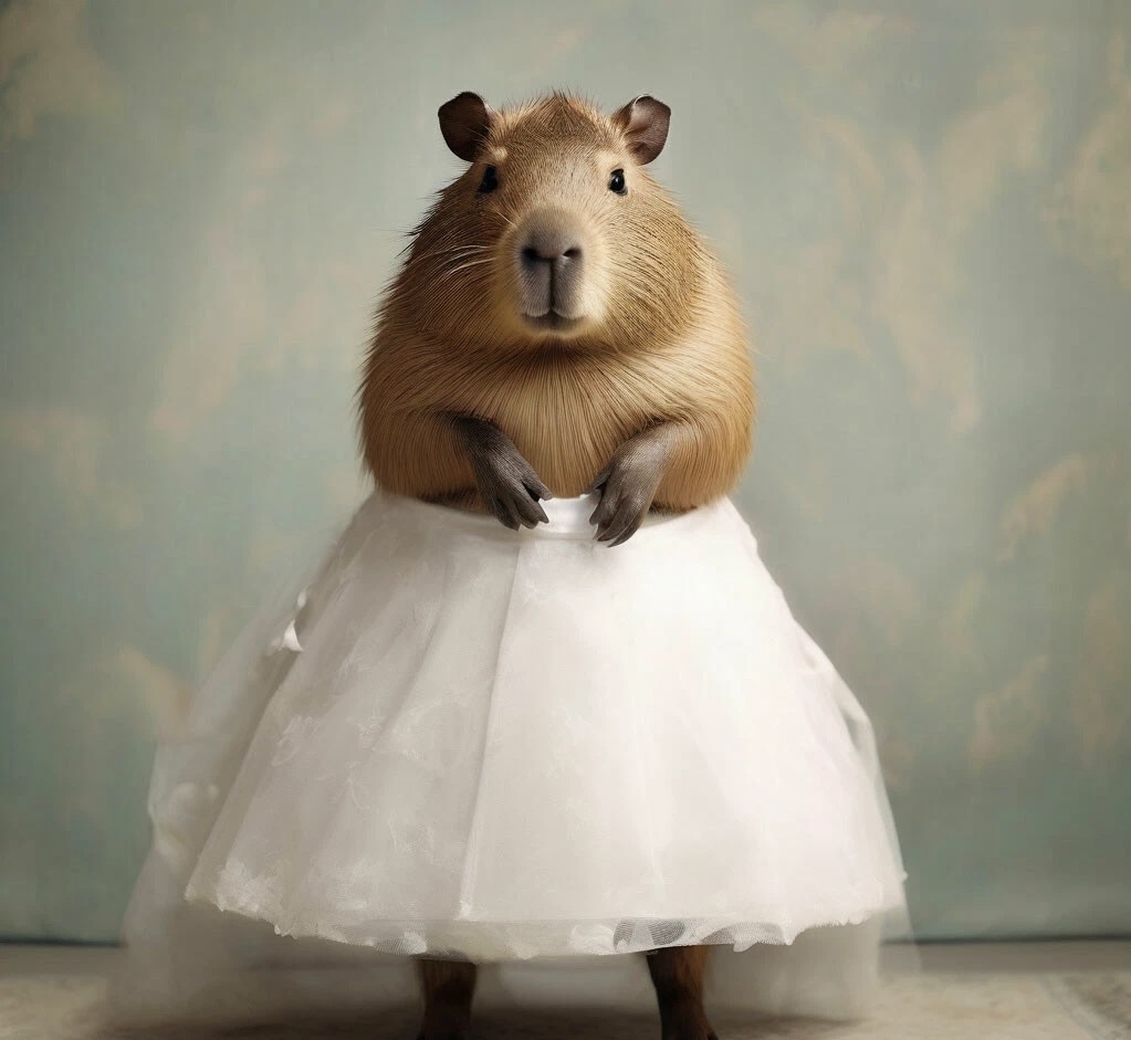 Традиционное бело свадебное платье, используемое в качестве праздничной одежды, предназначенной исключительно для сочетания браком или венчания, появилось в 19 веке, а именно 10 февраля 1840 года, когда английская королева Виктория впервые надела белый наряд на церемонию бракосочетания со своим будущим мужем. А теперь можем пофантазировать как бы выглядела королева Виктория, если бы была капибарой в свадебном платье.