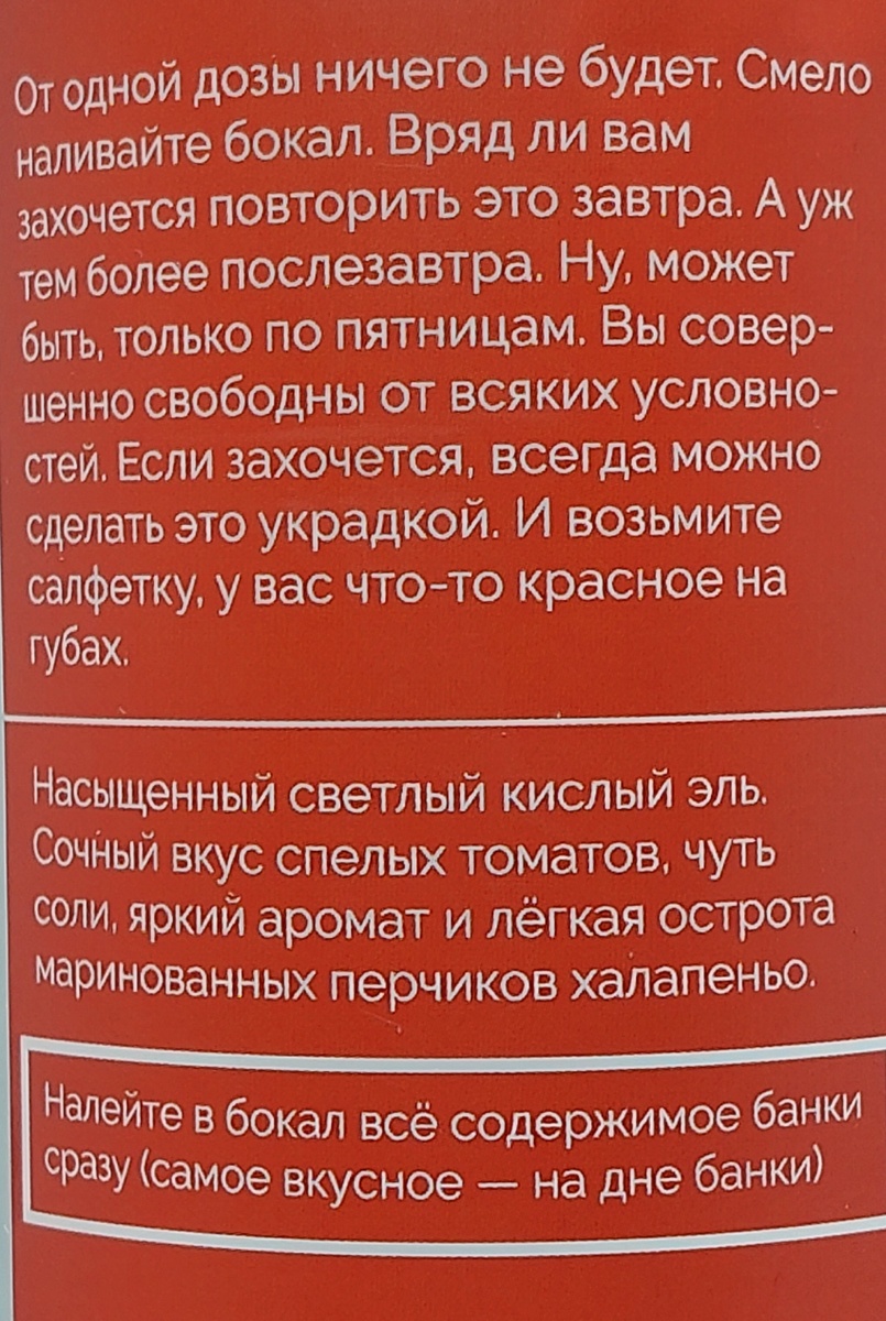 Небольшое вступление. Про линейку томатных гозе "Зависимость" от "Четырёх пивоваров" из города Владимир как минимум слышал каждый более-менее интересующийся российским крафтовым пивом. Моё знакомство с "Зависимостью" случилось более 15 месяцев назад и была то базовая версия напитка. Здесь нужно сказать, что с того времени моё отношение к томатным гозе изменилось лишь частично. Я и сейчас считаю, что стОят они зачастую неоправданно дорого. Подобные напитки в принципе воспринимаю как некий аттракцион и пробую что-то новенькое для себя исключительно с целью развлечения. На данный момент на UNTAPPD зарегистрировано 16 версий напитка "Зависимость". Сегодняшняя версия с халапеньо - для меня второй напиток из этой линейки. В целом не покупал "Зависимость" не потому что не понравилось. Наоборот: могу сказать, что это годный в каком-то смысле эталонный томатный гозе. Скажем так, я не сомневался, что и в остальных версиях напитка всё хорошо. Просто было не интересно. Почему же сейчас решил