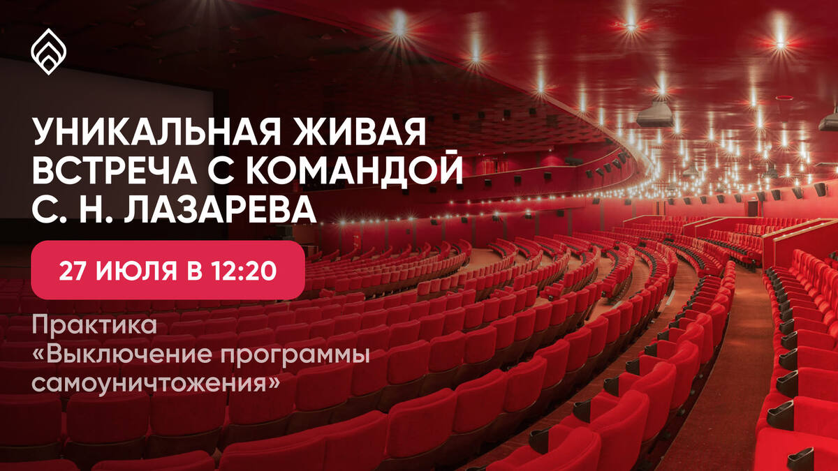 Друзья, уникальная возможность! Мы приглашаем вас принять участие в живой встрече с командой С.Н. Лазарева, которая состоится 27 июля в Москве, в киноцентре “Октябрь”. Специально для этого мероприятия была записана и впервые будет транслироваться новая практика С.Н. Лазарева “Выключение программы самоуничтожения”. Практика даст возможность переписать жизненную историю, осознав ошибки прошлого и изменив глубинные чувства. Она поможет перейти к новому мышлению, основанному на понимании кармических законов, и начать жить жизнью, полной гармонии и счастья. Помимо практики, участников встречи ждет трансляция ответов на вопросы читателей, записанная Сергеем Николаевичем. Он разберет самые важные и интересные многим вопросы, ответы на которые помогут вам в работе над собой. Также на встрече будет организована выставка картин Автора: если вам интересна эта сторона творчества С.Н. Лазарева, у вас будет возможность насладиться умиротворяющими пейзажами и энергичными, жизнеутверждающими абстракт
