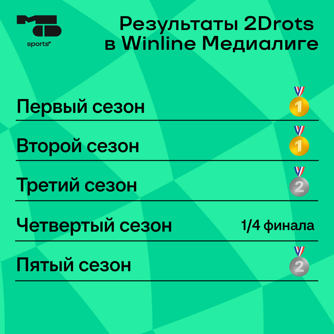 ● 2Drots выиграли два первых сезона Медиалиги. Но дальше – без побед. В финале МФЛ-3 проиграли «Родине Медиа», в МФЛ-4 срезались против «Эгриси» в 1/4 финала, в МФЛ-5 – проиграли в финале.