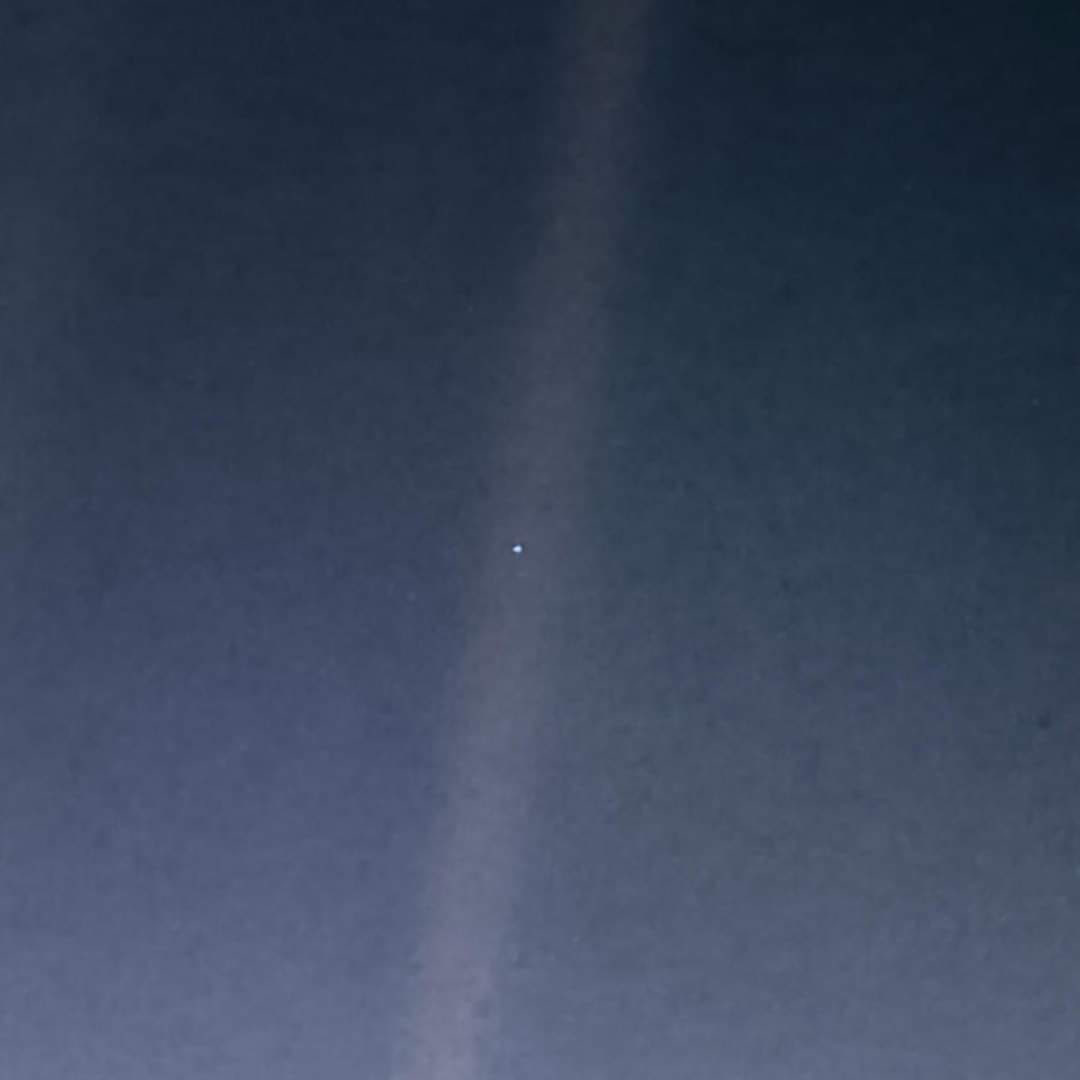 ...который производит впечатление не только на неокрепшие умы вроде моего. Фотографию сделал в 1990 году, через 13 лет после запуска, космический зонд "Вояджер-1". Это портрет планеты Земля с расстояния 6'000'000'000 (шесть миллиардов) километров. Два зонда держат путь в глубины космоса и несут золотые пластинки с записью послания человечества внеземным цивилизациям. Один из авторов проекта "Вояджер" по исследованию дальних планет, руководитель международной комиссии по созданию золотых пластинок, выдающийся астрофизик и пионер поисков инопланетного разума Карл Саган был одним из первых, кто увидел этот снимок — и написал: "Взгляните ещё раз на эту точку. Это здесь. Это наш дом. Это мы. Все, кого вы любите, все, кого вы знаете, все, о ком вы когда-либо слышали, все когда-либо существовавшие люди прожили свои жизни на ней.